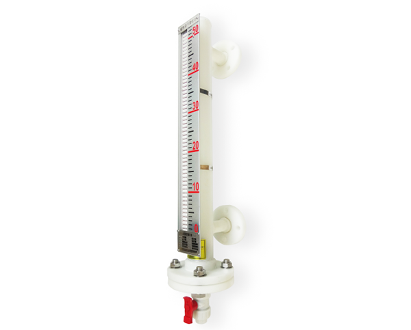 在您選用此產(chǎn)品前我們先將磁翻板液位計的工作原理作一簡單的介紹。它有一容納浮球的腔體我們稱其為主體管或外殼,它通過法蘭或其他接口與容器組成一個連通器;這樣它腔體內(nèi)的液面與容器內(nèi)的液面是相同高度的,所以腔體內(nèi)的浮球會隨著容器內(nèi)液面的升降而升降;這時候我們并不能看到液位,所以我們在腔體的外面裝了一個翻柱顯示器,因為我們在制造浮球時在浮球沉入液體與浮出部分的交界處安裝了磁鋼,它與浮球隨液面升降時,它的磁性透過外殼傳遞給翻柱顯示器,推動磁翻柱翻轉(zhuǎn)180°;由于磁翻柱是有紅、白兩個半圓柱合成的圓柱體,所以翻轉(zhuǎn)180°后朝向翻柱顯示器外的會改變顏色(液面以下紅色、以上白色),兩色交界處即是液面的高度。