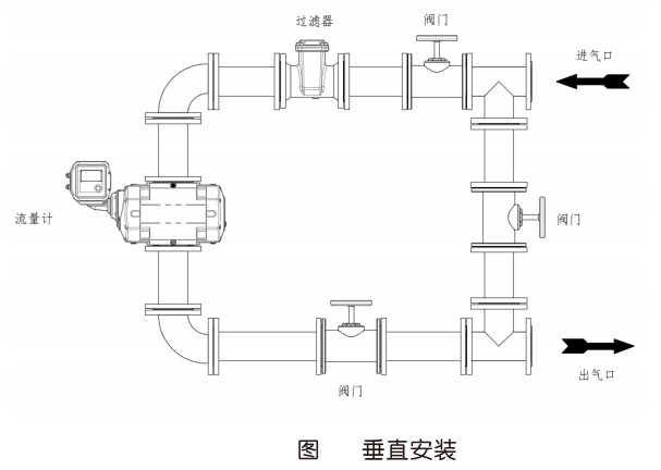 (4)為保證流量計正常運行,必須在流量計上游安裝專用氣體過濾器;(5)為便于對流量計進行后期維護和保養(yǎng),建議采用雙路設(shè)計或設(shè)置旁通管道;