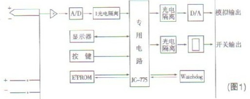 智能流量積算儀是由測量回路、數(shù)字面板表、調(diào)節(jié)器和電源四個部分組成。穩(wěn)壓電源將220V供電轉(zhuǎn)換成穩(wěn)定的直流電壓作為其它部分電源。測量回路將流量變送器送來的信號(電壓、電流等)經(jīng)過處理后,變?yōu)殡妷盒盘。該信號?jīng)過A/D轉(zhuǎn)換后輸送到JC-775專用中央處理器進(jìn)行處理后,不僅要送到數(shù)字面板表,而且也要送到調(diào)節(jié)器,與設(shè)定值比較后按調(diào)節(jié)規(guī)律輸出控制或報警信號。工作原理框(圖1)