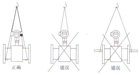 電磁流量計在搬運(yùn)和吊裝傳感器時,應(yīng)該將吊索套在傳感器兩端頸部位置或吊環(huán)上,切勿在測量管內(nèi)套入管棒進(jìn)行吊裝,以免損壞襯里(見圖)。在吊裝和搬運(yùn)電磁流量計過程中,必須防止傳感器襯里和接線盒受碰撞而損壞。