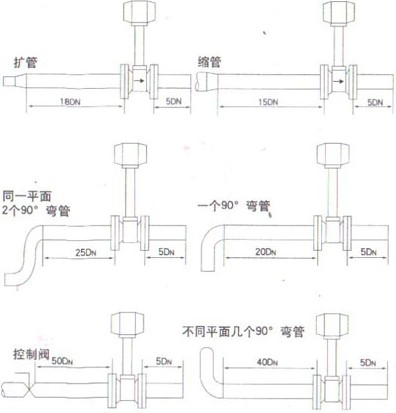 安裝條件:渦街流量計(jì)應(yīng)遠(yuǎn)離振動(dòng)源,有振動(dòng)時(shí)在前后直管段2DN處加支架用橡皮減振。傳感器通徑圓應(yīng)與直管段內(nèi)徑圓保持同心。法蘭焊接時(shí),密封夾緊時(shí),管內(nèi)不得有突出部分。流向應(yīng)與箭頭方向一致。(高溫時(shí)推薦2、3、4位置,常溫和低溫時(shí)推薦1位置,垂直管道時(shí)選3位置)見(jiàn)圖6