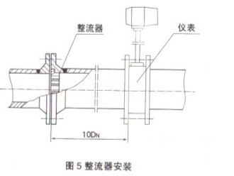 整流器的安裝:場(chǎng)地限制,直管段無(wú)法滿(mǎn)足,應(yīng)安裝整流器,見(jiàn)圖4,是一種非均勻分布多孔整流器,結(jié)構(gòu)簡(jiǎn)單,成本低,安裝方便,阻力損失小,安裝見(jiàn)圖5。