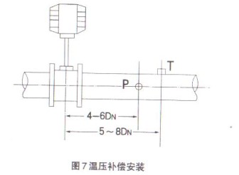 溫度壓力補(bǔ)償安裝:P-壓力變送器,T-溫度傳感器,安裝在后直管段上,見(jiàn)圖7。