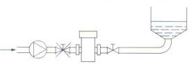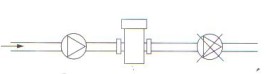 用聚四氟乙烯(PTFE)管材做的電磁流量計(jì)的傳感器襯里,它與傳感器測(cè)量管管壁一般不粘貼,因此,對(duì)真空負(fù)壓是敏感的。管道內(nèi)真空會(huì)抽癟聚四氟乙烯襯里,使襯里呈波浪型拱起——典型的負(fù)壓破壞形態(tài),這樣破壞了電極的密封,傳感器就不能工作了。因此,PTFE襯里的傳感器不能用于負(fù)壓系統(tǒng),也應(yīng)盡可能避免安裝在可能產(chǎn)生瞬間負(fù)壓的地方。如傳感器不應(yīng)裝在泵的吸入端;閘閥應(yīng)裝在傳感器的后側(cè),如圖所示。