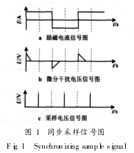 在現(xiàn)行的電磁流量計(jì)設(shè)計(jì)中,低頻矩形波勵(lì)磁方式結(jié)合了直流勵(lì)磁和交流勵(lì)磁兩者的優(yōu)點(diǎn), 成為主要?jiǎng)?lì)磁方式之一。在低頻勵(lì)磁方式下, 其干擾主要表現(xiàn)為: 由勵(lì)磁電流突變產(chǎn)生的微分干擾信號(hào)[ 1] 。理想勵(lì)磁磁場(chǎng)信號(hào)為低頻矩形波, 實(shí)際上隨著勵(lì)磁電流變化 ( dI /dt)在磁場(chǎng)上產(chǎn)生微分干擾信號(hào), 隨著電流的穩(wěn)定, 干擾信號(hào)隨之消失, 因此同步采樣技術(shù)可以有效抑制微分干擾信號(hào)。實(shí)際設(shè)計(jì)中, 模數(shù)轉(zhuǎn)化器使用 AD 公司的 24位 Sigma Delta模數(shù)轉(zhuǎn)化器 AD7714。 AD7714 可以分別采用硬件和軟件方式進(jìn)行采樣開始時(shí)間控制, 從而實(shí)現(xiàn)同步采樣。采用軟件方式時(shí), 當(dāng)控制寄存器中FSYNC位為邏輯 1時(shí), 模數(shù)轉(zhuǎn)換器處于復(fù)位狀態(tài); 向該位寫邏輯 0時(shí), 器件開始采樣輸入信號(hào)。在應(yīng)用中,低頻勵(lì)磁信號(hào)由 M SP430單片機(jī)內(nèi)部定時(shí)器產(chǎn)生, 同時(shí)產(chǎn)生采樣信號(hào)。如圖 1所示, 采樣開始時(shí)間滯后勵(lì)磁信號(hào)14 個(gè)周期。