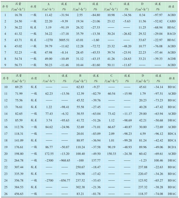 試驗(yàn)數(shù)據(jù)見(jiàn)表1,其中流量表示污水流量計(jì)60min內(nèi)的累計(jì)流量;A、B、C、D分別為4個(gè)型號(hào)的超聲波流量計(jì)在60min內(nèi)的累計(jì)流量;排名為與同一臺(tái)污水流量計(jì)比對(duì)的4臺(tái)超聲波流量計(jì)的誤差按從小到大的順序。