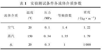 為驗證仿真分析得到的結論,利用負壓法音速噴嘴氣體流量計量標準裝置、蒸汽實流計量標準裝置和水流量計量標準裝置對該結構類型的渦街流量計進行三種介質的實驗研究,各測試條件參數(shù)如表 1 所示。