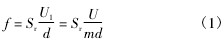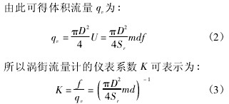 式中: f 為旋渦頻率; Sr為斯特勞哈爾數(shù); m 為旋渦發(fā)生體兩側弓形面積與管道橫截面面積之比,不可壓縮流體中,由于流體密度 ρ 不變,由連續(xù)性方程可得到 m = U/U1。