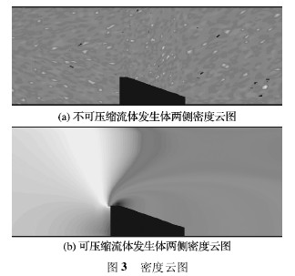 根據(jù)公式 ( 1) 可知,影響渦街流量計旋渦頻率的是發(fā)生體兩側的流速 U1和發(fā)生體的結構,由于發(fā)生體結構尺寸是固定的,因此頻率只與 U1相關,需要觀測在相同入口流速 U 的條件下 U1變化來得到頻率的變化,而速度的變化必然會導致流體密度的變化,因此可觀測發(fā)生體兩側的密度云圖,來判斷可壓縮性對渦街流量計流速 U1的影響,通過仿真得到如圖 3 ( a) 所示的不可壓縮流體發(fā)生體兩側的密度云圖和如圖 3 ( b) 所示的可壓縮流體發(fā)生體兩側的密度云圖。