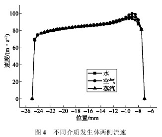 根據(jù)圖 3 得到的結論,對渦街流量計進行蒸汽、空氣和水三種介質下的軟件仿真,設置三種介質的入口流速均為 50 m/s,取渦街發(fā)生體迎流面?zhèn)壤庵悬c與管壁連線,如圖 2 中線段 ab所示。取該線上的速度值,將蒸汽、空氣和水三種介質下的速度曲線進行比較,結果如圖 4所示。