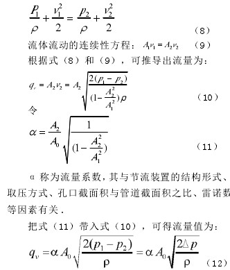 1 引 言 轉(zhuǎn)子流量計(jì)和差壓式流量計(jì)是工業(yè)上和實(shí)驗(yàn)室中的流量計(jì). 雖然都是測(cè)量流量的儀表,但是其原理卻大相徑庭,其流量基本方程的推導(dǎo)也不相同,因此,導(dǎo)致儀表的特點(diǎn)和適用場(chǎng)合也有所區(qū)別 . 2 流量計(jì)組成與流量測(cè)量原理 2.1 轉(zhuǎn)子流量計(jì) 轉(zhuǎn)子流量計(jì),是由一個(gè)自下往上逐漸擴(kuò)大的帶刻度的錐形管和一個(gè)置于錐形管內(nèi)可以自由上下移動(dòng)的轉(zhuǎn)子構(gòu)成. 工作時(shí),被測(cè)流體由錐形管下端進(jìn)入,沿著錐形管向上運(yùn)動(dòng),流過(guò)轉(zhuǎn)子與錐形管之間的環(huán)隙,再?gòu)腻F形管上端流出 . 受流動(dòng)流體帶動(dòng)作用,轉(zhuǎn)子受到一個(gè)自下向上流體對(duì)轉(zhuǎn)子的動(dòng)壓力,正好等于轉(zhuǎn)子在被測(cè)流體中的重力(即轉(zhuǎn)子自身的重力減去流體對(duì)轉(zhuǎn)子的浮力). 垂直安裝流量計(jì)時(shí),轉(zhuǎn)子重心就在錐形管中心軸線上,轉(zhuǎn)子所受的三個(gè)力都平行于中心軸線 . 當(dāng)受力平衡時(shí),轉(zhuǎn)子就穩(wěn)定在錐管內(nèi)某一位置上 . 對(duì)于給定的轉(zhuǎn)子流量計(jì),轉(zhuǎn)子的材料、大小和形狀都可確定,所以轉(zhuǎn)子在被測(cè)流體中的重力是已知的,只有流體對(duì)轉(zhuǎn)子的動(dòng)壓力是隨流體流速大小而變化的 . 因此當(dāng)流體流速變大或變小時(shí),轉(zhuǎn)子受到的動(dòng)壓力增大或減小,轉(zhuǎn)子將作向上或向下的移動(dòng),轉(zhuǎn)子與錐形管壁之間的環(huán)隙面積也發(fā)生變化,即流動(dòng)截面積也發(fā)生變化,待變化到某一流速轉(zhuǎn)子受力平衡時(shí),轉(zhuǎn)子就穩(wěn)定在新的位置上 . 對(duì)于一臺(tái)給定的轉(zhuǎn)子流量計(jì),轉(zhuǎn)子在錐管中平衡位置的高低反應(yīng)了被測(cè)流體流經(jīng)錐形管的流量大小 . 2.2 差壓式流量計(jì) 差壓式流量計(jì)由三部分組成,即由節(jié)流裝置、導(dǎo)壓管和差壓計(jì) . 差壓式流量計(jì)是利用流體流動(dòng)的節(jié)流原理來(lái)實(shí)現(xiàn)流量測(cè)量的.節(jié)流原理是流體在有節(jié)流裝置的管道中流動(dòng)時(shí),在節(jié)流裝置前后的管壁處,流體的靜壓力產(chǎn)生差異的現(xiàn)象 . 流動(dòng)流體的能量有靜壓能和動(dòng)能兩種形式.流體具有靜壓能是因?yàn)橛袎毫Γ哂袆?dòng)能是因?yàn)橛辛鲃?dòng)速度,在一定條件下,這兩種形式的能量是可以相互轉(zhuǎn)化 . 根據(jù)能量守恒定律,在沒(méi)有外加能量的前提下,流體所具有的靜壓能和動(dòng)能,再加上用以克服流體流動(dòng)阻力的能量損失,其能量總和是相等的 . 圖 2 表示在節(jié)流裝置前后截面Ⅰ、Ⅱ及Ⅲ處流體壓力與速度的分布情況 . 流體在到達(dá)截面Ⅰ之前,以一定的流速 v1流動(dòng),此時(shí)靜壓力為 p1. 在接近節(jié)流裝置時(shí),由于遇到節(jié)流裝置的阻礙,使靠近管壁處的流體受到節(jié)流裝置的阻擋作用,使部分動(dòng)能轉(zhuǎn)化為靜壓能,使得節(jié)流裝置入口端面靠近管壁處的流體靜壓力升高,并且遠(yuǎn)大于管徑中心處的壓力,因此節(jié)流裝置入口端面處產(chǎn)生一徑向壓差 . 在徑向壓差的作用下,流體產(chǎn)生徑向加速度,從而使靠近管壁處的流體質(zhì)點(diǎn)的流動(dòng)方向傾斜于管道中心軸線,出現(xiàn)縮脈現(xiàn)象.由于受到慣性作用,流束的最小截面并不在節(jié)流裝置的孔口處,而是經(jīng)過(guò)節(jié)流裝置之后仍繼續(xù)收縮,到截面Ⅱ處流束達(dá)到最小,此時(shí)流速最大,即 v2,之后流束又逐漸擴(kuò)大,至截面Ⅲ后完全恢復(fù),流速逐漸降到原值,即 v3=v1. 由于節(jié)流裝置產(chǎn)生流束的局部收縮現(xiàn)象,使流體的流速隨之變化,即動(dòng)能也跟著變化 . 根據(jù)能量守恒定律,表征流體靜壓能的靜壓力也要變化 . 在截面Ⅰ處,流體具有靜壓力 p1. 在截面Ⅱ處,流速增到最大 v2,靜壓力就降到最小 p2,而后又隨著流束的恢復(fù)而恢復(fù) . 由于在節(jié)流裝置端面處流通面突然縮小,而節(jié)流裝置之后流通面積突然又?jǐn)U大,使流體形成局部渦流,部分能量被消耗,同時(shí)流體流經(jīng)孔板時(shí),為克服摩擦力也需消耗能量,所以流體在截面Ⅲ處的靜壓力 p3不能恢復(fù)到原值 p1,而產(chǎn)生永久的壓力損失. 截面Ⅰ與Ⅱ處的壓差(δp=p1- p2)與流體在節(jié)流裝置前的流量有一一對(duì)應(yīng)關(guān)系,只要測(cè)出節(jié)流裝置前后的壓差大小即可表示流量大小 . 2.3 總結(jié) 轉(zhuǎn)子流量計(jì)與差壓式流量計(jì)在工作原理上是不相同的 . 轉(zhuǎn)子式流量計(jì),是在節(jié)流面積(如孔板流通面積)不變的條件下,以差壓變化來(lái)反映流量的大;而差壓式流量計(jì),卻是以壓降不變,利用節(jié)流面積的變化來(lái)測(cè)量流量的大小.即轉(zhuǎn)子流量計(jì)的測(cè)量原理可以簡(jiǎn)化為:恒壓降、變節(jié)流;差壓式流量計(jì)的測(cè)量原理簡(jiǎn)化為:變壓降、恒節(jié)流 . 3 流量方程推導(dǎo) 3.1 轉(zhuǎn)子流量計(jì) 轉(zhuǎn)子流量計(jì)中當(dāng)轉(zhuǎn)子穩(wěn)定時(shí),對(duì)轉(zhuǎn)子進(jìn)行受力分析: 其中:ρt為轉(zhuǎn)子的密度;ρf為流體的密度;V 為轉(zhuǎn)子的體積;Δp 為轉(zhuǎn)子前后的壓差(常數(shù));A 為