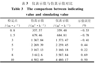 為了驗(yàn)證通過上述方法所得到的插入式電磁流量計(jì)等效信號作用范圍的可靠性,把該尺寸的傳感器探頭形狀加工制作成流量計(jì)樣機(jī)在口徑為 400mm 的管道上進(jìn)行流量測量,插入深度也保持在 120mm。其測量得到的體積流量與仿真得到的流量進(jìn)行對比,如表 3 所示,其中計(jì)算仿真流量示值所用的流速是上述得到的等效信號作用范圍內(nèi)的平均流速ū。