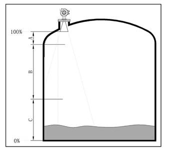 - 若介質為低介電常數(shù)當其處于低液位時,罐低可見,此時為保證測量精度,建議將零點定在低高度為C 的位置。