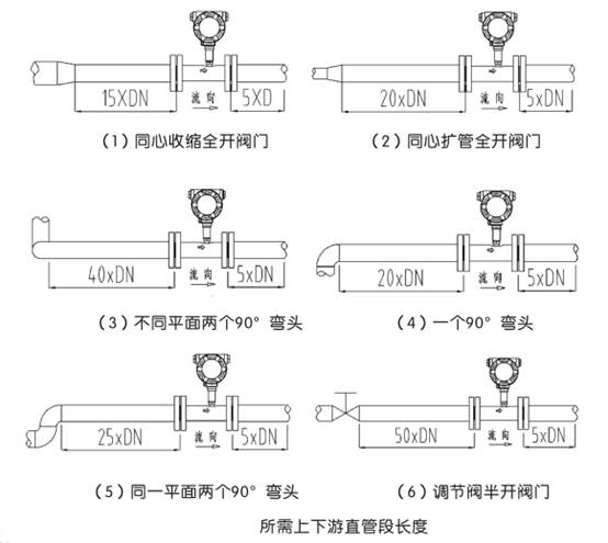 渦輪流量計對管道內(nèi)流速分布畸變及旋轉(zhuǎn)流是敏感的,進(jìn)入傳感器應(yīng)為充分發(fā)展湍流,因此要根據(jù)傳感器上游側(cè)阻流件類型配備必要的直管段或整流器,要求入口段和出口段直管段長度。
