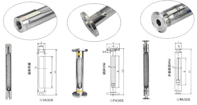 LZB-VA/WA/FA 30S系列玻璃轉(zhuǎn)子流量計外殼為不銹鋼304材質(zhì),接口有內(nèi)螺紋、活套法蘭、衛(wèi)生型快裝接頭三種規(guī)格連接新形式,產(chǎn)品輕巧美觀適用。